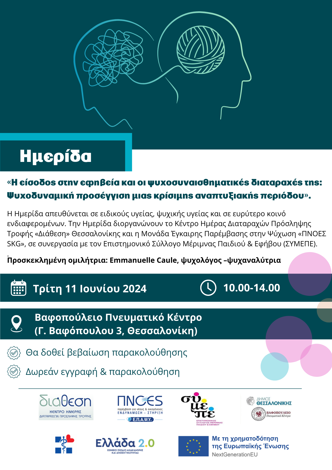 Τρίτη 11 Ιουνίου Ημερίδα στο Βαφοπούλειο “Η είσοδος στην εφηβεία και οι ψυχοσυναισθηματικές διαταραχές της”. Προσκεκλημένη ομιλήτρια: Emmanuelle Caule 4 Ιουνίου, 2024 Διαβάστε Περισσότερα »
