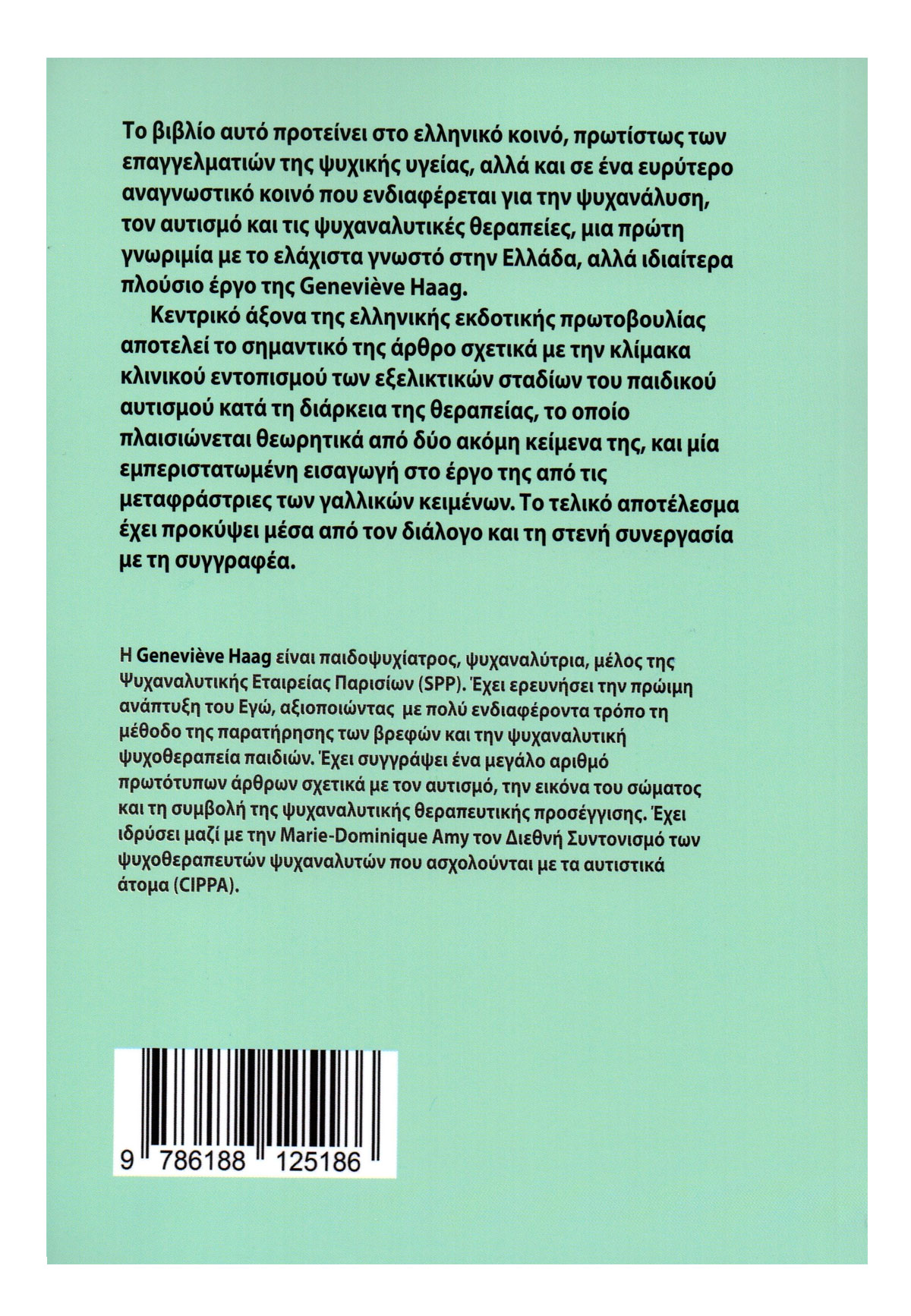 Το βιβλίο αυτό προτείνει στο ελληνικό κοινό, πρωτίστως των επαγγελματιών της ψυχικής υγείας, αλλά και σε ένα ευρύτερο αναγνωστικό κοινό που ενδιαφέρεται για την ψυχανάλυση, τον αυτισμό και τις ψυχαναλυτικές θεραπείες, μια πρώτη γνωριμία με το ελάχιστα γνωστό στην Ελλάδα, αλλά ιδιαίτερα πλούσιο έργο της Genevieve Haag.